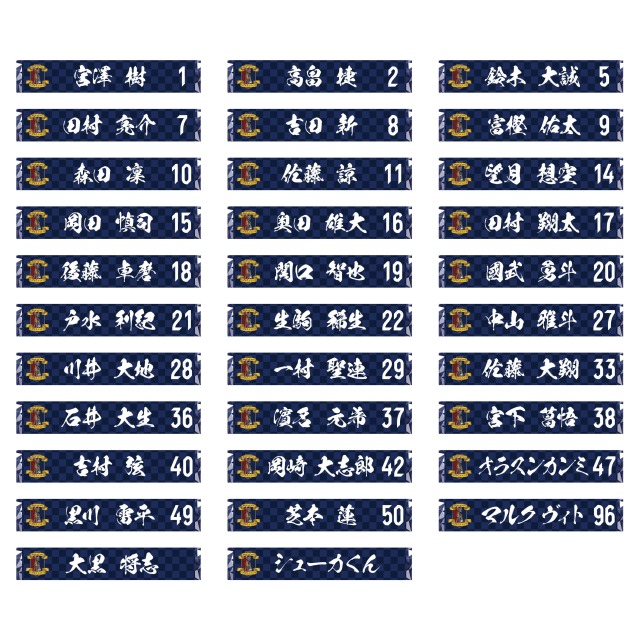 <素材> 綿 <サイズ> 約20cm×110cm <選手ラインナップ> 全30選手+シューカくん+大黒将志(監督)